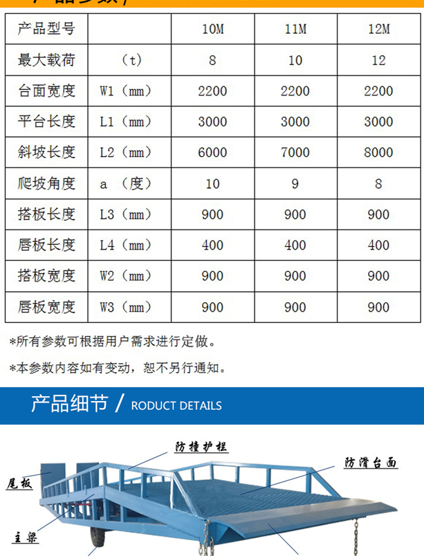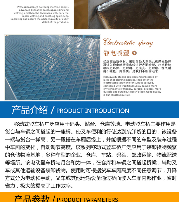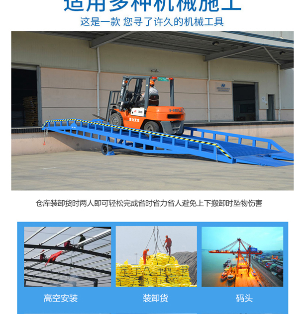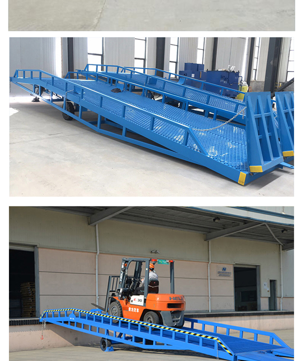 固定式登車橋廣泛應用于碼頭、站臺、倉庫等地。電動登車橋主要作用是貨臺與車輛之間搭起的一座橋。使叉車便利的行使達到裝卸貨的目的,該設備一端與貨臺一樣高,另一段搭在車廂后緣上,并能根據不同的車型及裝車過程中車廂的變化,自動調節(jié)高度。